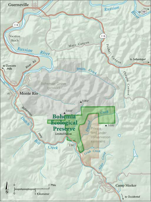 Bohemia Ecological Preserve is about halfway between Occidental and Monte Rio on the Bohemian Highway (which runs north from the Bodega Highway). It’s open only for guided outings and special events, so contact LandPaths for more detailed directions: outings@LandPaths.org, (707)524-9318.