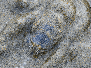 Another beach animal that burrows rapidly is the sand (or mole) crab. But it burrows backwards. In fact, sand crabs can only move backwards, whether they’re digging, crawling, or swimming. Their burrows are in the “swash zone,” where the waves wash up and back on the beach. Because the tide is always changing, the crabs must move and rebury themselves often to stay in that zone.