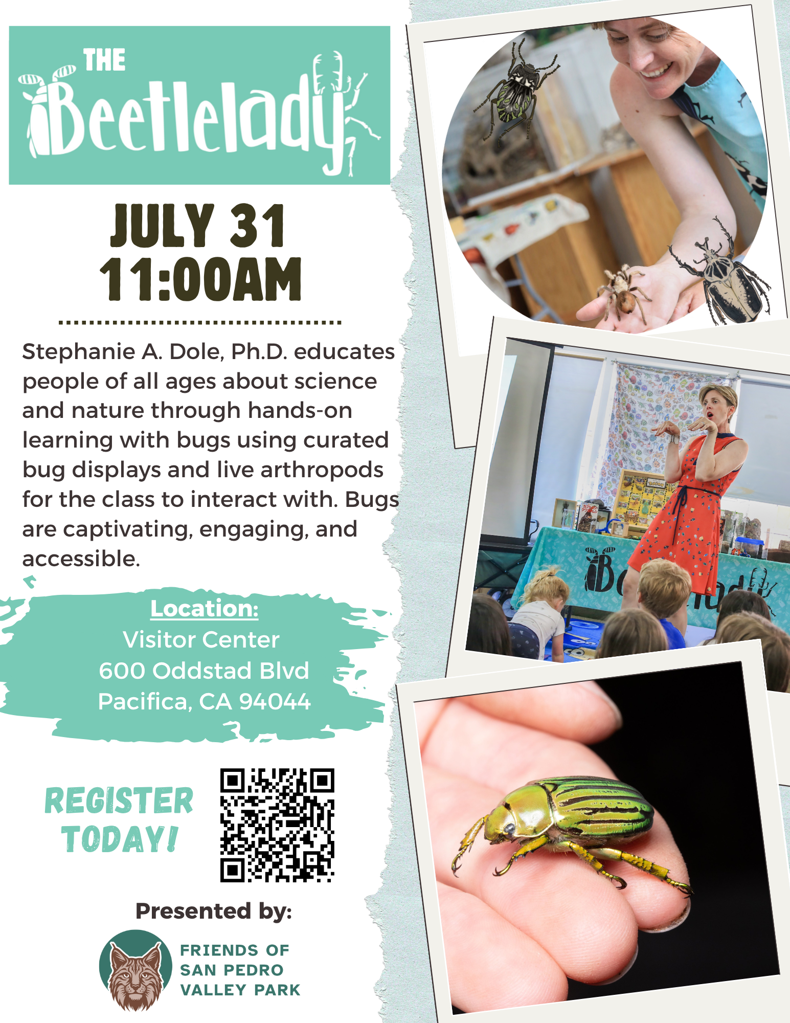 Join the Friends of San Pedro Valley Park as they present Stephanie A. Dole, Ph.D. (The Beetle Lady) who educates people of all ages about science and nature through hands-on learning with bugs using curated bug displays and live arthropods … Read more