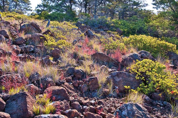 The chaparral and cypress form an eerie and striking landscape, with stunted trees spreading their limbs over rough red-and green-hued boulders of serpentinite. Impenetrable thickets of manzanita grow under and around the trees. The rare Baker’s manzanita is common on this property, one of a small number of places it is found.
