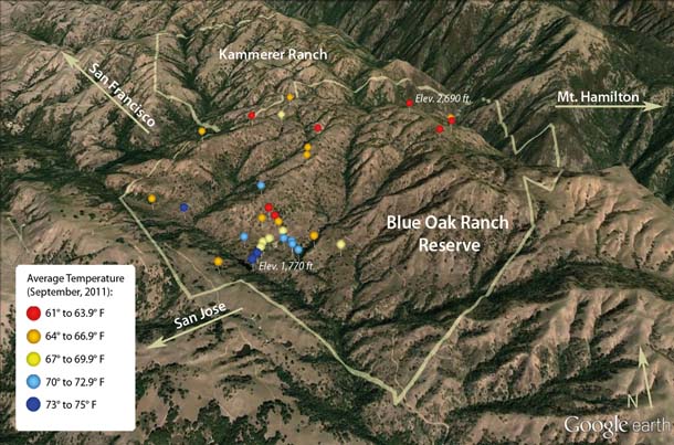 Hamilton logs on to his laptop and calls up a topographical rendering of Blue Oak Ranch. Sixty sensors appear on the map, strategically placed to capture the property’s range of conditions; all of them, explains Hamilton, transmit their data in real time to a central research station. He retrieves temperature information for the preceding 24-hour period on one of the sensors and displays it as a graph: The lines show a 30-degree variance between midday and nocturnal temperatures. That’s heartening, emphasizes Hamilton. “That shows the impact of the marine layer,” Hamilton says. “We like to see that. Coastal influence helps mitigate climate impacts. The greater the temperature range, the more potential there is for adaptation. We still have those cooler niches here that native plants and animals can exploit.”